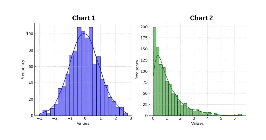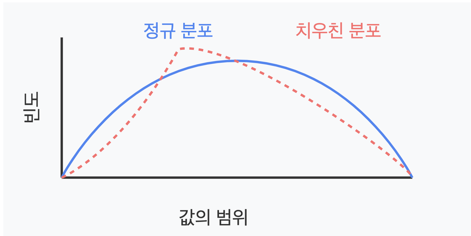 ![정규분포와 치우친 분포 비교] 왼쪽: 정규 분포 / 오른쪽: 오른쪽으로 치우친 분포