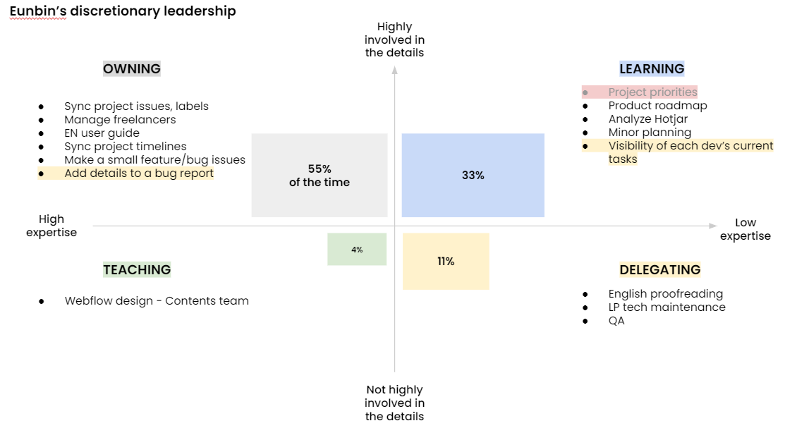 Owning이 가장 큰 부분을 차지하고 있다면 현재 우선순위에 잘 집중하고 있는 것이다. 내가 잘 분류했는지 모르겠다면 사수나 동료들에게 보여주고 피드백을 얻어보자. 팀이 내가 무엇에 더 집중하길 원하는지 파악하고, 내가 더 키우고 싶은 강점을 알면, 둘을 접목시키고 타협할 부분을 찾을 수 있을 것이다.