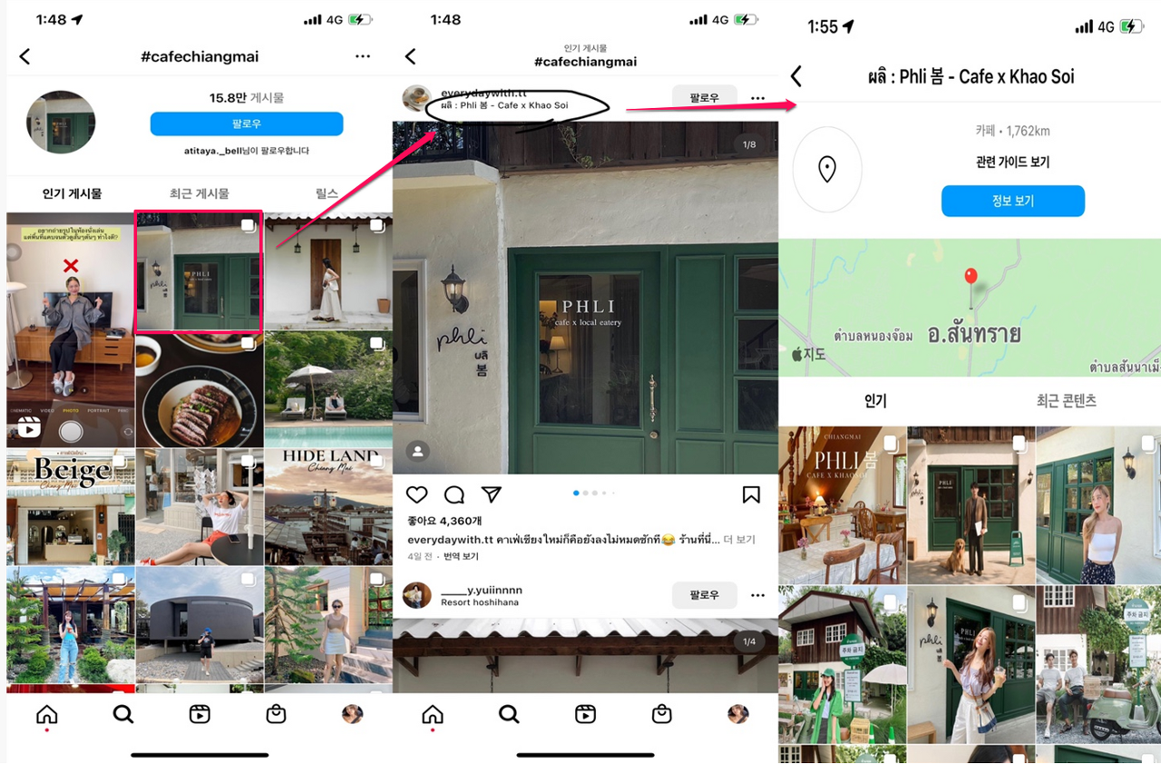 한국인, 외국인이 치앙마이의 카페를 찾을 때 넣는 키워드를 찾는데 한 시간이 걸렸다. #치앙마이카페, #카페치앙마이, #Chiangmaicafe, #chiangmaicafe 등 소문자와 대문자도 바꿔보며 인스타그램에 쳐봤다. #chiangmai cafe는 결과물이 21.1만이었다. 이것보다 범위가 적은 키워드를 찾고 싶었다. 이걸 #cafechiangmai로 바꿔 입력하니 15.8만의 결과물이 나와 이 키워드를 공략하기로 했다. '카페'와 '치앙마이'를 거꾸로 바꿔 조합한 것이다.