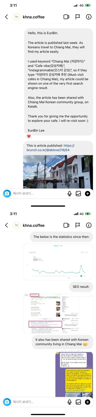 어쨌든 카페 사장님들은 정말, 정말 좋아하셨다. 이 스크린숏을 보내드렸을 때 감동하시며 다음에 오면 더 많은 커피를 무료로 제공해주겠다고 말씀하셨다. 태국 치앙마이 언제 다시 방문할지 모르겠지만 사장님들과 돈독한 동료 친구가 된 것 같아 기뻤다.